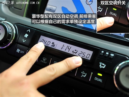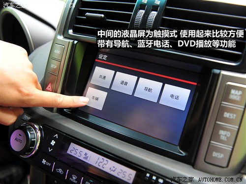 中间的液晶屏为触摸式设计,相比那些旋钮和摇杆操作更加直观简单,而其功能也很丰富,导航、蓝牙电话,DVD播放等功能一应俱全。液晶屏下方的是空调控制区,普拉多采用双区自动空调,主副驾驶可以分别调节自己需要的温度。