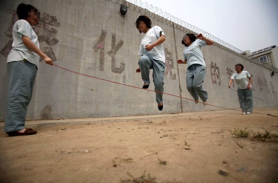 河北省强制隔离戒毒所,在封闭的操场内,几名女孩在跳绳。戒毒人员会经常分成小组的活动,这是他们放松的时间。