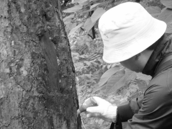 近日,嵊州林业人员在三界镇驻跸岭处为一棵树打病害预防针。 为有效保护森林树木,防止病虫害发生,嵊州有关部门组织力量深入林区为树木号脉打针,截至6月底,已为5000多棵树木打了病害预防针。 (记者 俞其军 摄)
