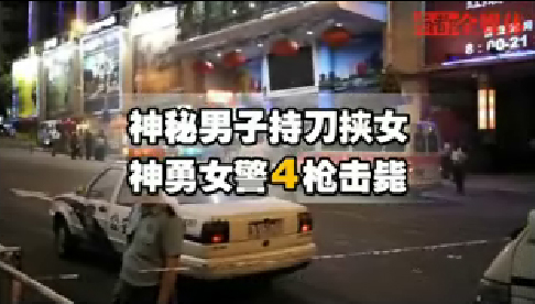 7月6日晚8时许,一男子在广州站南路抢劫一名男子时遭对方反抗,疑犯持剪刀将被抢的男事主刺伤后逃跑。随后,疑犯持刀劫持路过的女事主,至晚上9时30分,一位便衣女警抓住有利战机,连开4枪,将其当场击毙。人质被成功解救。