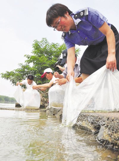 剡溪是嵊州的母亲河。为确保水产增收,促进水系生态平衡,丰富市民菜篮子,市水利水电局连续多年坚持放养鱼苗。今年,市水利水电局在剡溪放养鲢鱼、鳙、草鱼等鱼苗100万尾,数量为历年之最。图为7月8日工作人员正在放养鱼苗。