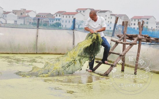长乐镇太平村邢农儿今年首次在30亩水塘里养殖泥鳅,首开我市农民规模养殖泥鳅的先河。图为邢农儿在水塘里管理。