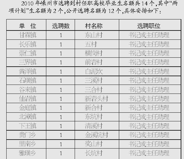 根据中共绍兴市委组织部、绍兴市人事局《关于组织开展2010年到村任职高校毕业生选聘工作的通知》(绍市人〔2010〕28号)和中共嵊州市委办公室、嵊州市人民政府办公室《关于引导和鼓励高校毕业生到农村和社区工作的实施意见》(嵊市委办〔2006〕39号)文件精神,经研究,决定继续组织开展农村选聘高校毕业生工作。现将有关事项公告如下: