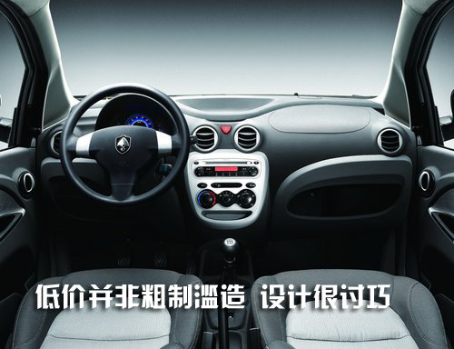 奔奔mini的中控台设计与前两款车型有所不同,与前者相比面积利用率更大,各部件的摆放位置也更合理耐看。中控台面板为一微微凸出平面,辅以银色涂装,具有上佳的人机工程学设计;空调出风口是四个可完全关闭的原型状;副驾驶前方手套箱由抽屉式变成开放式;门壁板手枕加宽,更便于使用。