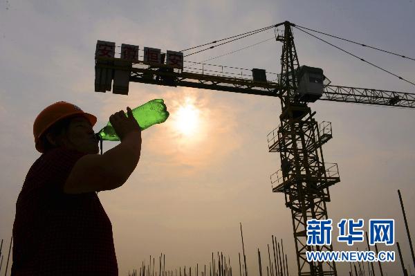7月7日,在安徽亳州市南部新区建设工地,一名工人在工作间隙喝水抵御高温。当日是农历小暑节气,亳州市继续出现高温天气,建设者们在烈日下坚持工作。 新华社发(张延林 摄)