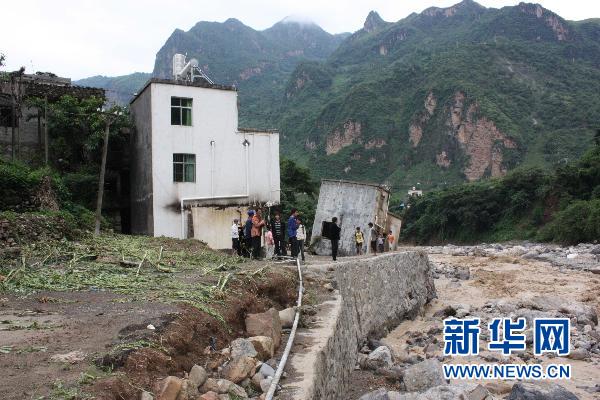 | 7月13日,云南昭通市巧家县小河镇村民站在受损的房屋外。新华社发 |