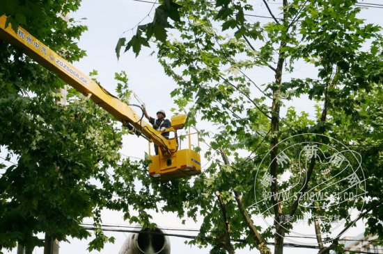 城关中学门前人行道上的树枝高端接近高压电线,为排除安全隐患,保证安全用电,有关部门近日动用升降机械锯除了高端树枝。