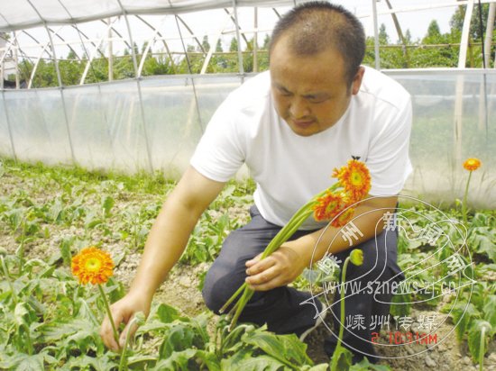 孟林军正在采摘“午睡”的非洲菊