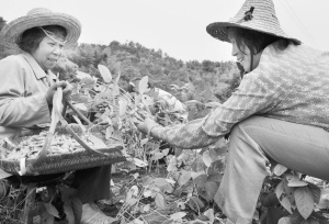 嵊州市北漳镇的山地鲜毛豆荚是当下的时令蔬菜,由于这里的豆荚生长地理环境优越,近年来已成为宁波许多蔬菜市场的定点采购点,当地群众在田头就可销售鲜毛豆荚。图为昨日,该镇东林村的老太太们正在采摘鲜毛豆荚。