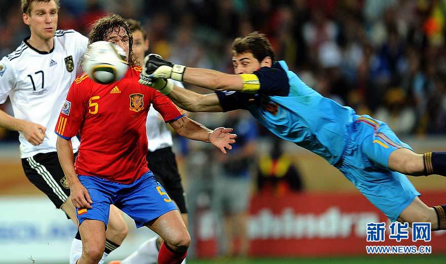 7月7日,西班牙队守门员卡西利亚斯(右)双拳解围。当日,在德班举行的2010南非世界杯足球赛半决赛中,德国队迎战西班牙队。新华社记者王毓国摄