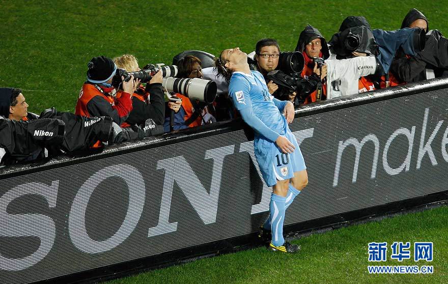 7月10日,乌拉圭队球员弗兰赛后倚靠在广告牌上。当日,在伊丽莎白港举行的2010南非世界杯足球赛季军争夺战中,乌拉圭队以2比3不敌德国队。新华社记者廖宇杰摄