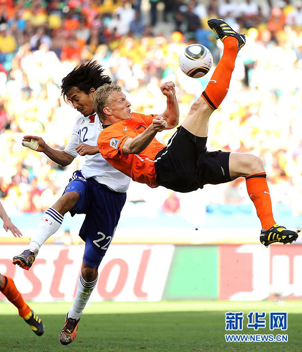 6月19日,荷兰队球员库伊特(右)在比赛中倒钩。当日,在德班举行的2010年南非世界杯足球赛E组的第二轮比赛中,荷兰队迎战日本队。新华社记者廖宇杰摄