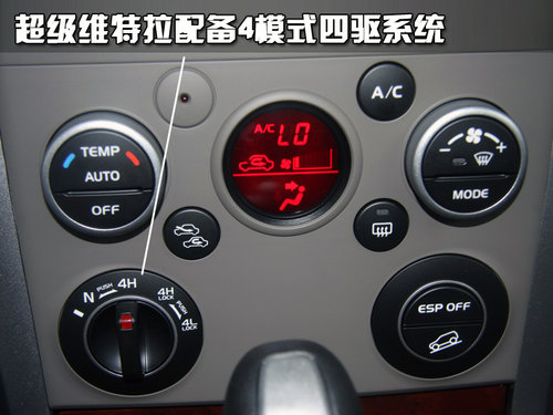 铃木全新超级维特拉虽然在动力方面有极大的提升,但整体外观并没有太多的改变,仍传承着第三代维特拉的经典设计。超级维特拉采用半承载式车身结构,高强度的底盘和车身能够抵御在恶劣路况行驶时所产生的冲击。全新超级维特拉都是全时四驱车型,可以更好地兼顾越野性能。全时四驱系统内容很丰富,设置了空档、自动、高速锁定和越野车必备的低速锁定4种模式,能够从容面对很多同级车无法逾越的艰险路况。