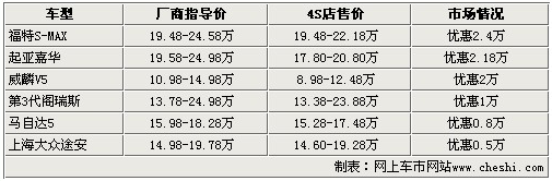 通过上表我们可以看出,六款车型在售价方面都有不同程度的下浮。其中以嘉华、福特S-MAX和威麟V5为首的大幅度降价车型,降价幅度都达到了2万元以上。第3代阁瑞斯独领一万元降价区间,马自达5和途安这两款更为热销的车型,由于关注度较高,现车也较为紧张,优惠幅度也仅有5千元和8千元的小幅度降价优惠。
