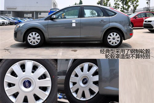 由于2011款主要是针对配置进行升级,所以福克斯的外形和09款基本没有区别,上图为新增的经典款车型,它和舒适型在外观上与高配车型的主要区别就是没有前雾灯。另一个比较明显的区别是轮毂的改变,经典型为钢轮毂,轮毂罩也没有动感。