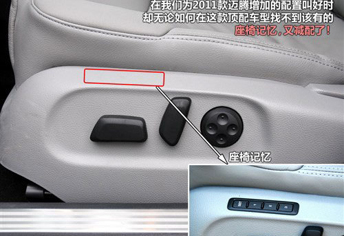 不过必须批评的是迈腾一方面在积极的增配,改善用户体验,另一方面还不忘简配,之前出现在舒适型和豪华型上的座椅记忆功能在2011款全系中都被简配掉了。