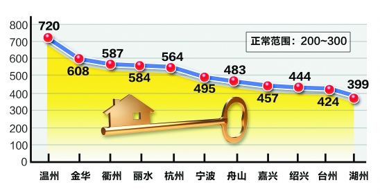 根据国际经验,在成熟的市场经济中,租售比的合理范围在200~300之间。但浙江省11个城市的房屋租售比,全部在300以上,温州已经达到720,意思是说,买一套房子,需要用60年的时间才能收回购房的成本,远超警戒线。杭州也达到了564,差不多需要47年时间收回成本。