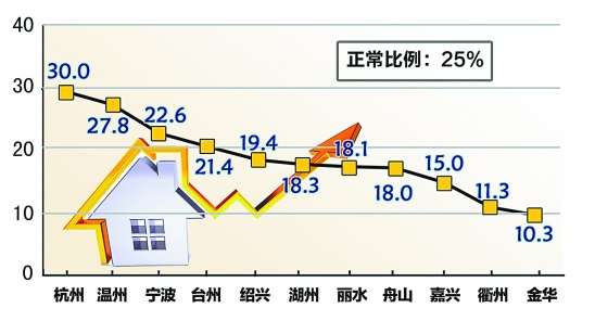 根据国际经验,一般居民家庭住房消费支出占其收入的25%以内是合理的,30%以内是可以承受的。数据显示,我省的房租收入比基本在正常范围之内,最高的杭州为30%。最低的为金华,仅为10.3%。从这个数据来看,如果家庭通过租赁方式满足基本居住消费需要,经济上是可行的。白皮书分析,政府在住房保障的规模和力度方面压力不大,要重点关注房价过快上涨带来的购房困难,防止由此带来的各种结构性矛盾和问题。