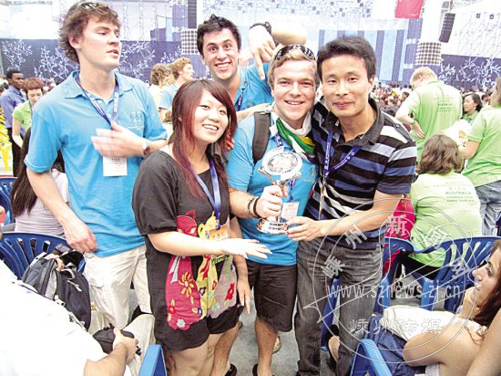 嵊州派出的服务组长与南非合唱团成员欢庆胜利