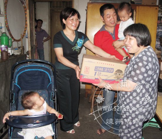 图为在白莲堂社区,家有龙凤胎的市民获赠奶粉的场景。