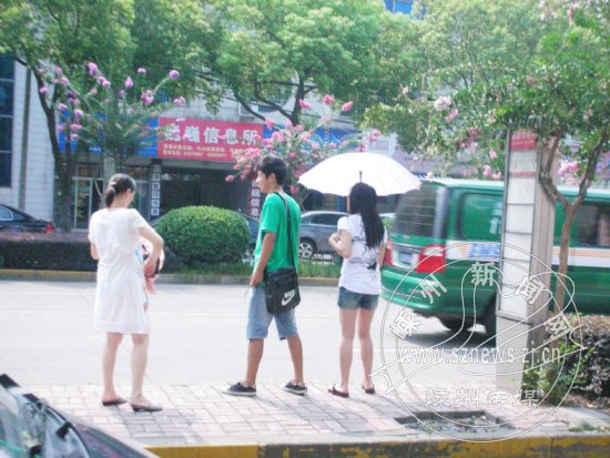 昨日上午,官河路上靠近市新闻传媒中心的公交车站点,有几人在烈日下苦等公交车。这个公交站点没有遮阳棚已很长时间了,乘客在太阳下等车确实吃不消。(求之)