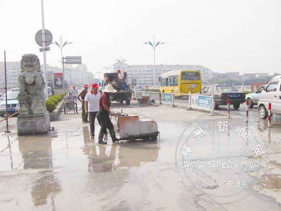 经过26天的紧张施工,104国道新东桥桥头专项整治工程于28日上午完工,提前14天恢复了双向通行。104国道新东桥经过多年的运行,加上交通量的快速增长,部分桥头出现了不同程度的沉陷,造成桥头错台,车辆行驶时有“跳车”现象,俗称“桥头跳”。此次整治工程完工后,从根本上改善了路面外观,提高了行车的安全度和舒适度。图为施工人员正在进行最后一道工序刷缝。