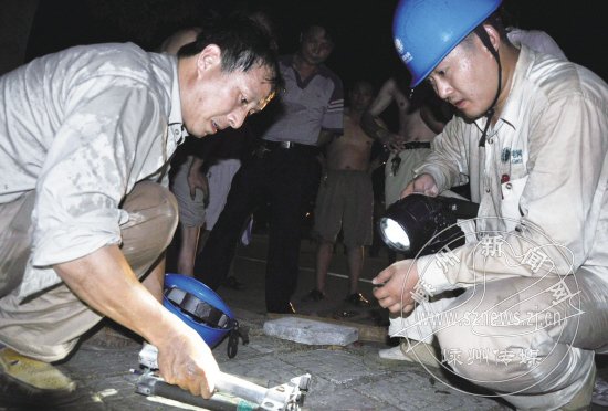 图为8月2日深夜电力职工在经济开发区前杨村抢修用电设备。(史华东摄)