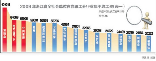 参照浙江省统计局发布的2009年浙江省全社会单位在岗职工年平均工资统计公报,中等收入群体主要集中在金融业、建筑业、电力煤气及水的生产和供应业、教育、信息传输与软件业、房地产业(见表一)。