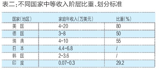 这个比例并不算高。从全球范围来看,目前中等发达国家的中等收入群体一般占45%左右,美国达到80%(见表二),阿根廷、巴西等发展中国家也已达到35%。