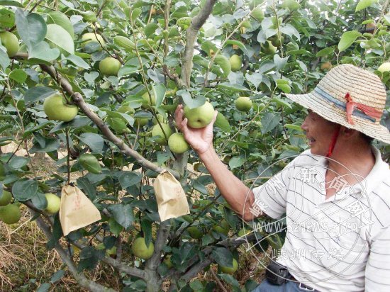 同样的土地,同一个品种,由于管理方法不同,经济效益有天壤之别。有的果农种植的翠冠梨每公斤批发价在一元左右,但甘霖镇西叶村朱益民实施科学种植,他种的翠冠梨个大,味甜,亩产3000多公斤,每公斤批发价三元左右,客户找上门,销售不用愁。 图为朱益民喜采翠冠梨。