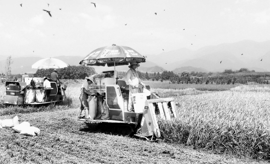 上半年,嵊州市共投入中央直补资金937万元,购置插秧机、联合收割机、机械育秧设备、谷物烘干机等各类补贴农机具7837台。到目前为止,该市水稻全程机械化普及率达62%,为“双夏”抢收抢种打下了良好基础。图为昨日长乐镇农民机械收割场面。 【来源:绍兴日报】