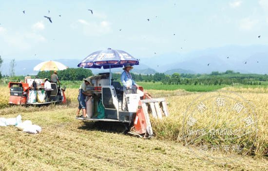 上半年,全市共投入中央直补资金937万元,购置插秧机、联合收割机、机械育秧设备、谷物烘干机等各类补贴农机具7837台。到目前为止,全市水稻全程机械化作业率达62%,为“双夏”抢收抢种打下了扎实基础。图为长乐镇农民机械收割场面。