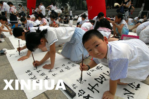 西湖区进贤门小学的许诺(前右一)等学生正在书写经典国学名句。新华社记者 宋振平 摄
