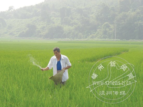 目前,全市22万亩单季稻已进入了分蘖盛期,长势普遍较好。各地粮农抢抓时机,认真做好肥培管理,施好分蘖肥以更好地促花抽穗。图为三界镇沈塘村的粮农正在给长势良好的单季稻施肥。