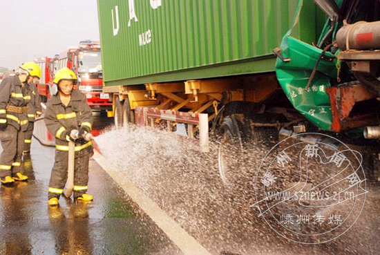 笔者赶到事故现场时,只见一辆宁波牌照的集装箱大货车停在慢车道上,驾驶室完全塌陷,整个车头几乎嵌入槽罐车尾部,司机受伤被困驾驶室内,已处于休克状态;而一辆车牌号为浙BC54ⅹⅹ的槽罐车尾部严重破损,罐体上“危险品”三字显得特别醒目,不明液体像流水一样“哗啦啦”地向下流到高速路面上,高速交警、消防官兵、路政、环保、医疗等救援人员正在积极商讨排险方案。