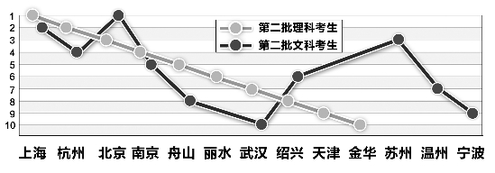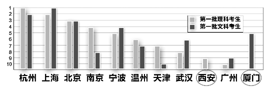 无论理科还是文科,求学地的选择,十大城市九个相同,不同的一个是在西安和厦门间选择。