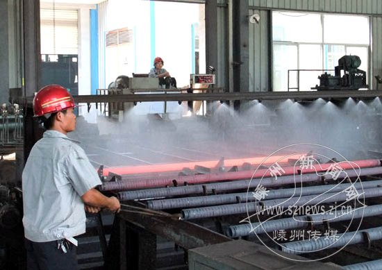 在浙江富立轴承钢管有限公司的加热穿孔车间内,工人们正在为通红的钢管喷水冷却(如图)。据介绍,钢管刚刚出炉时的温度接近一千摄氏度,整个车间炽热如同火炉,但工人们依然一丝不苟坚守岗位。作为目前中国工艺设备和测试手段最先进的专业轴承钢管制造企业,富立公司的产品质量和生产管理已得到SKF、NSK等国际多家著名轴承制造商的认可,进入了世界高端轴承钢管市场。通过增加年产2万吨特种钢管生产线,公司今年销售预计将突破2亿元。