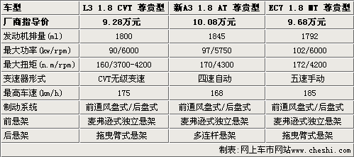 帝豪EC7的最大功率高于其他两款车型,并且配备了五速手动变速箱,能拥有185km/h的最高车速是比较正常的。相对而言,奇瑞A3的动力优势并不明显,再配备四速自动变速箱,动力和经济性也明显不如其他两款车型。比亚迪L3的发动机虽然功率比较小,但CVT无级变速箱给这款车加分不少,而且通风盘式制动也不逊于其他产品。