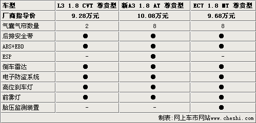 另外,奇瑞新A3全系都标配了ESP电子稳定系统,紧急情况下可以大大提高整车的安全性,在主动安全方面更加优秀。另外,帝豪EC7系列车型都配备了胎压监测装置,这种配置在炎炎夏日或者出游的时候非常实用。相对而言,比亚迪L3虽然是全新车型,但在安全配置方面确实没有太多亮点可言。