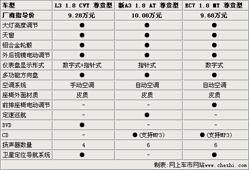 奇瑞新A3和帝豪EC7都采用自动空调,而比亚迪L3却依然采用手动机械式空调,相对而言有些落伍。奇瑞新A3虽然配备了定速巡航系统,在高速驾驶中可以带来更多的舒适性,但个人认为也带来一定的安全隐患。比亚迪L3配备了DVD系统,和帝豪EC7一样都配备了GPS导航功能。奇瑞新A3配备支持MP3、WMA音频格式的CD音响,与帝豪EC7一样都配备6声道音响系统,比比亚迪L3的音响效果应该更出色。