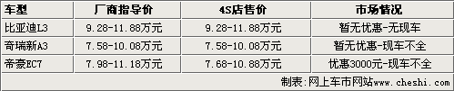 比亚迪L3、奇瑞新A3、帝豪EC7市场行情