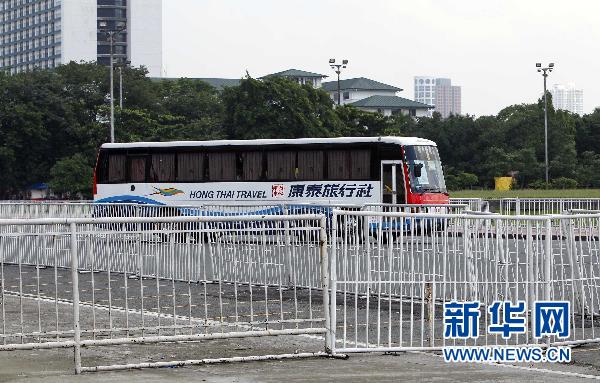 8月23日,在菲律宾首都马尼拉,被劫持的旅游观光客车停在基里诺大看台附近。