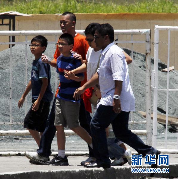 8月23日,在菲律宾首都马尼拉的基里诺大看台附近,谈判专家(右一、右四)协助几名被释放的游客离开被劫持的旅游观光客车。