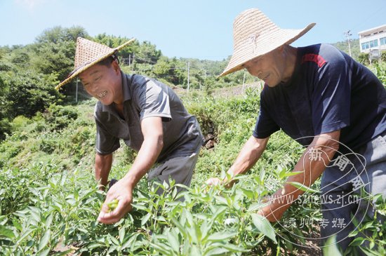 仙岩镇舜皇村郑财法等村民种植了2.5亩四季高山蔬菜,现在辣椒、青瓜、豇豆、南瓜等都已成熟,价格超过普通蔬菜,如高山辣椒每公斤达12元,成为农民创收的路子。图为郑财法(左)和村民在采摘高山辣椒。