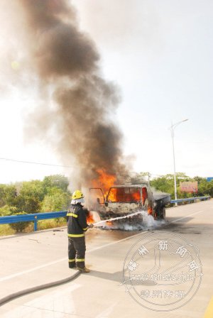 当日下午3时,市消防大队值班室接到报警:位于甘霖镇高速路口处一货车着火,火势较大,但车上无人员被困。大队迅速出动警力赶赴现场,经过10分钟的努力,大火被成功扑灭(如图)。