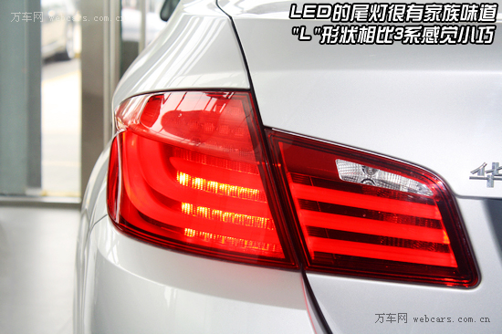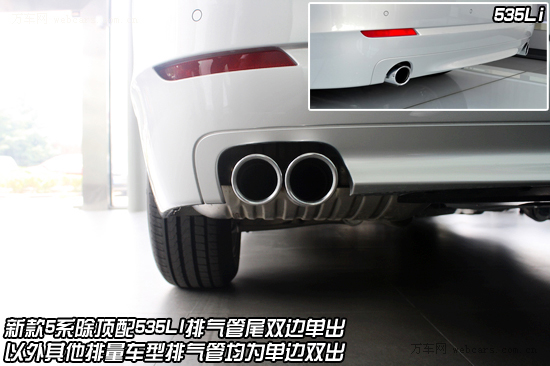 新5系的尾灯也采用家族风格,“L”型尾灯与LED搭配的非常和谐。而排气管则是区分排量的最好区别,因为除了顶配535Li之外,其他排量的车型排气管均为单边双出。与尾部相比,轮毂和轮胎相对保守许多,225/55R17的轮胎也基本算及格。