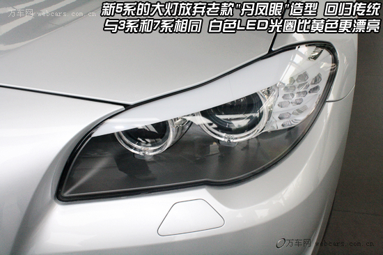 新款5系前大灯也是一大亮点,取消老款“丹凤眼”的设计风格,重归经典,与3系,7系等车型相同。而白色LED的天使眼也取代了黄色,说实话,白色真的比黄色好看,不过希望不会是选装。