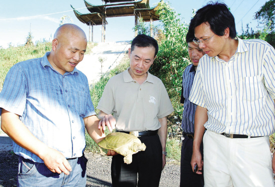 近年来,嵊州市新改造生态鱼塘1700亩,建设高标准鱼塘320亩,实现国家补助现代农业发展资金100万元,顺利实现渔业产业转型升级,丰富了市民菜篮子。图为8月19日,省水产专家和领导在嵊州市绿宝生态鳖合作社进行指导。