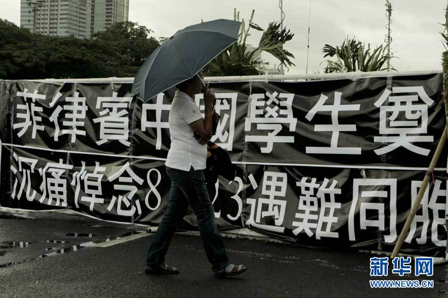 8月31日,在菲律宾首都马尼拉,一名菲律宾人走过劫持人质事件悼念活动的条幅。当日,这里举行劫持人质事件悼念活动,为逝者寄托哀思。新华社发(法布里加尔摄)