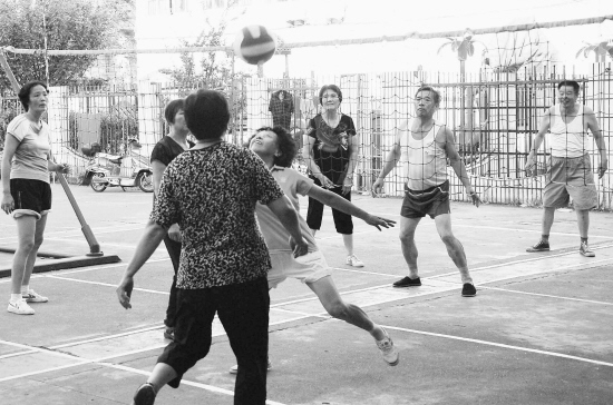 嵊州市越秀社区的老人们,在一块空场地上架起了一个简易排球网,每天早晨引来不少球迷前来练球或比赛,成为爱好排球的老人们的一处乐园。